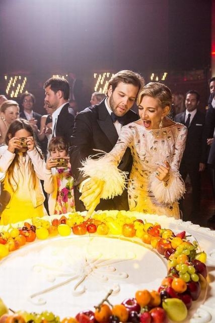 Chiếc bánh cưới màu trắng hình ảnh mặt trời ở trung tâm và được trang trí với hoa quả tươi